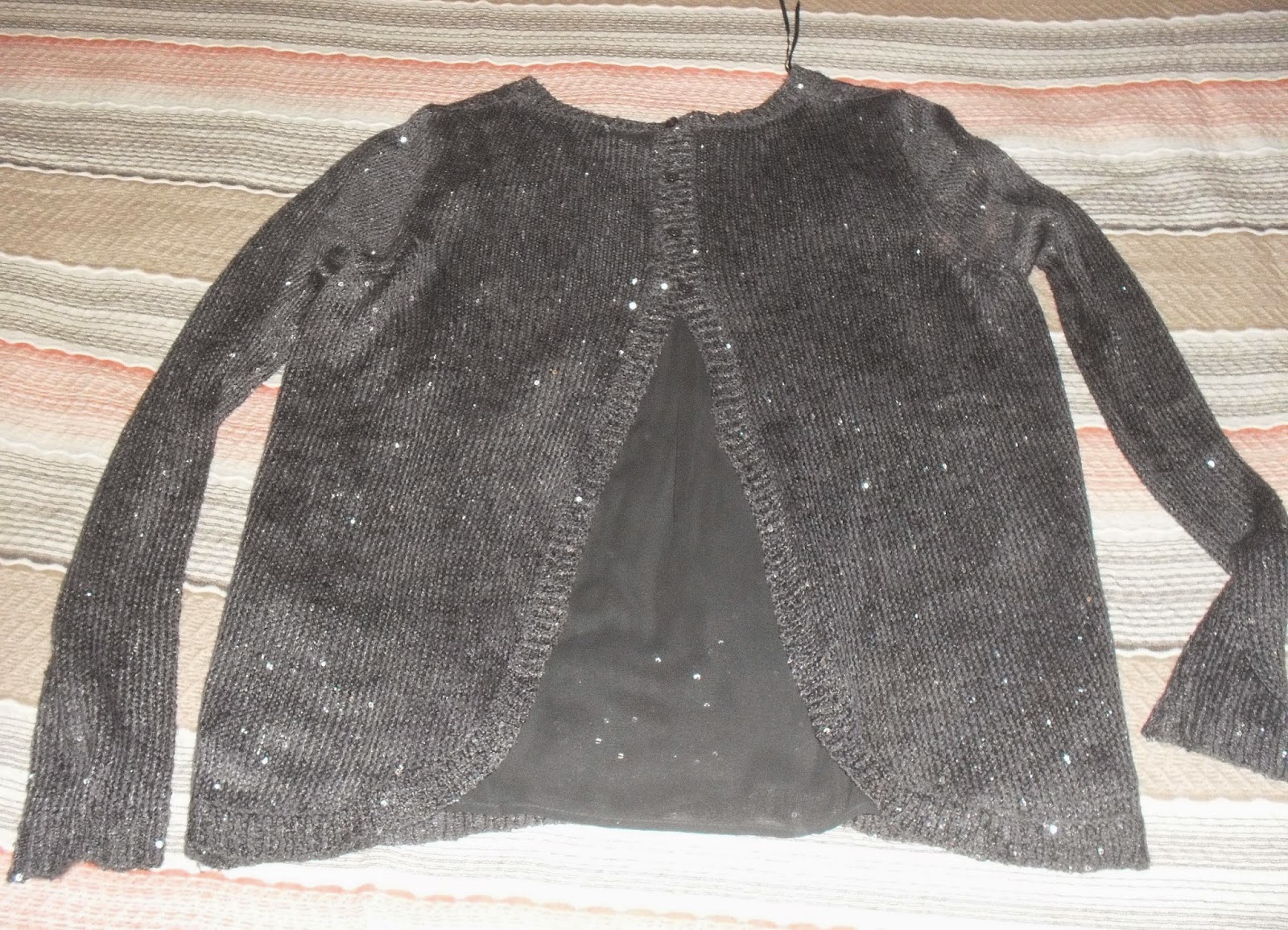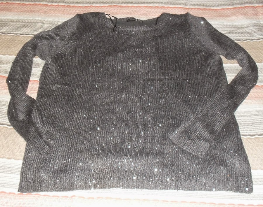 Y el tercero es algo más de fiesta como podeis ver, ligeramente ancho también con brillantitos sin pasarse!!! en un color gris precioso, entra por la cabeza, aunque hace un simulacro como si se abrochara por detrás en su parte de arriba y luego queda por bajo como una gasa en el mismo tono del suéter, me gusta muchísimo y me parece estupendo para un look arreglado con unos pantalones o falda negras pero también para darle un toque especial a los vaqueros para una salida noctura.