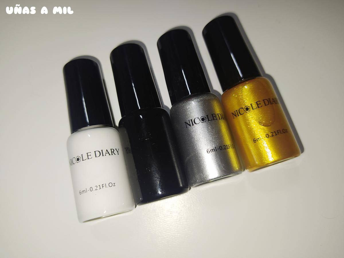Como también necesitaba reponer algunas cositas, ahora vamos con las compras on-line a través de Aliexpress, me compré un pack de 4 esmaltes especiales para estampar de la marca Nicole Diary en los tonos que mas utilizo: blanco, negro, dorado y plateado.