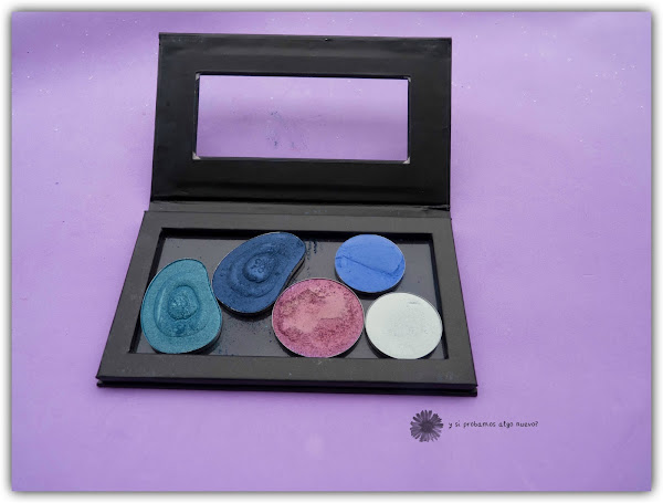 Esta paleta imantada vacía me costó menos de 5€, la pena es que ya no está disponible el link, supongo que buscando un poco seguro que salen más. Es pequeña y manejable, mide 14,5 x 8,2 cm y caben unas 8 sombras como las de la derecha, que son las de Essence.