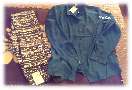 En H&M me hice con una blusa verde esmeralda, en la foto no se aprecia el color tan bonito que tiene y la caída de la tela que parece que fuera seda, sienta fenomenal. También me llevé unos pantalones. Me llamó mucho la atención el estampado. Hacía mucho tiempo que no llevaba pantalones estampados, últimamente solo he comprado vaqueros y pantalones lisos. Me dije, porque no, vamos a ponérnoslos a ver como quedan y encantadísima porque son un poquito elásticos y se adaptan fenomenalmente a la cintura y la cadera. Resultado, se vinieron conmigo a casa.