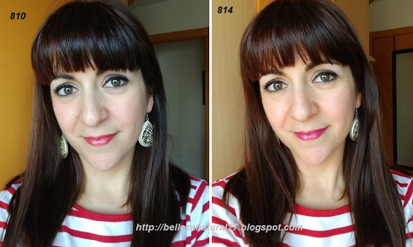 Empezamos con los labiales: Los tonos elegidos fueron el 810 (rojo anaranjado con destellos) y el 814 (rosa tirando a malva). La verdad es que me los hubiera quedado todos porque tienen unos colores preciosos y me encanta el acabado glossy porque da más sensación de volumen en los labios. Además, tienen una textura muy cremosa e hidratante que hace que los labios no se resequen. En cuanto a su duración, es bastante buena, no son permanentes, pero duran bastantes horas sin moverse ni borrarse. Además, por poco más de 3 euros que me costaron cada uno, no se puede pedir más. El packaging es sobrio y muy elegante, y los colores son bastante intensos para el acabado que tienen. A continuación os dejo unas fotos para que podáis verlos mejor: