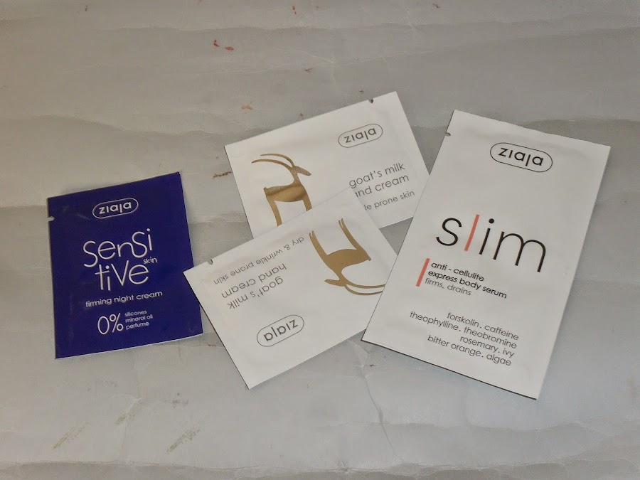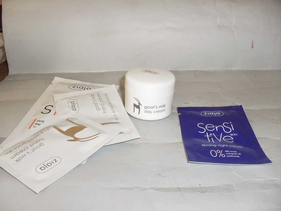 Unas muestras de crema de día de cabra, de crema de manos y de crema anticelulítica de la marca Ziaja.