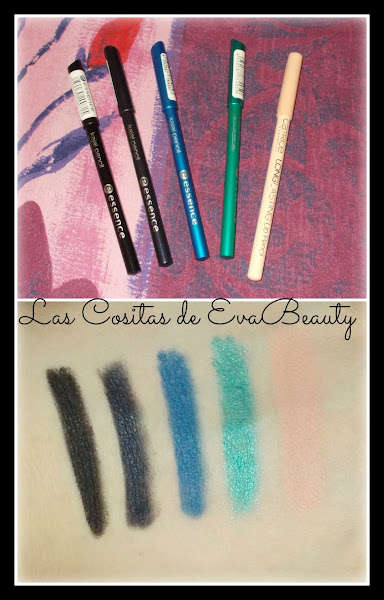 Cogí 4 delineadores de ojos de la gama kajal de Essence, son los 4 primeros de los swatches.