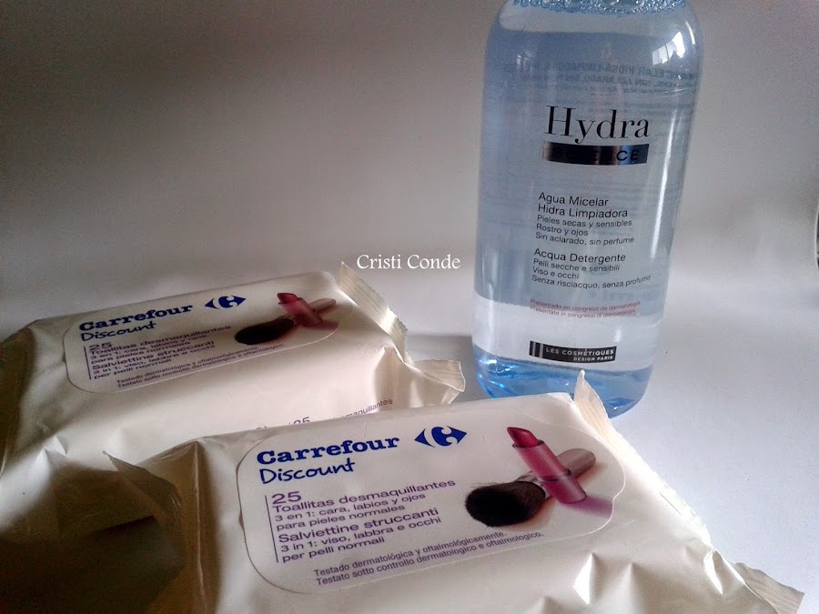 Pues bien me pase por Carrefour a hacer la compra y aproveche para comprarme una botella de Agua Micelar que me encanta, su precio es de 5? y trae 500ml. Ya que estaba aproveche para comprarme toallitas desmaquillantes, siempre viene bien tenerlas tanto para los suaches como para una emergencia, yo suelo tener un paquete en el coche por que nunca se sabe lo que puede pasar jajaja. Estas vienen en un pak de dos paquetitos y cada uno trae 25 toallitas, creo que su precio fue de 2? mas o menos.