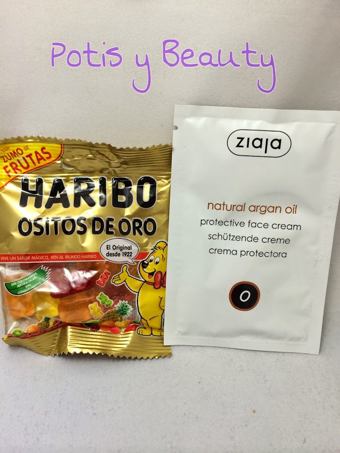 Siempre regalan algo :P Ositos Haribo que le encantan a mi chico, así que son para él y una muestra de una crema protectora con aceite de argan de Ziaja, esto es para mi....