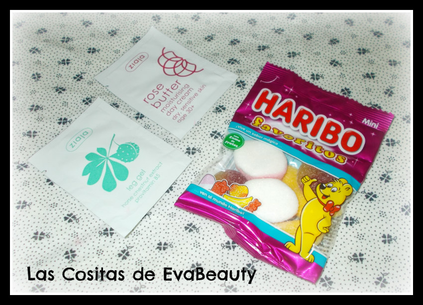 Y como regalo por mi pedido me incluyeron unas chuches de Haribo, una muestra del gel para piernas y pies cansados de Ziaja y una muestra de la crema de día de rosa mosqueta de Ziaja.
