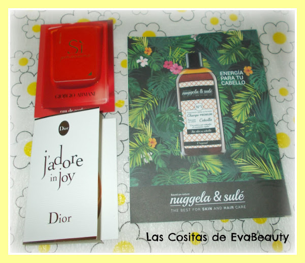 Y como regalo por mi compra, me enviaron una muestra en solapa del agua de perfume Sí Passion de Giorgio Armani, una muestra en vial del agua de colonia Jadore in joy de Dior y una muestra en sobre del Champú de cebolla de la marca Nuggela & Sulé, que me ha gustado mucho porque quería probar este champú.