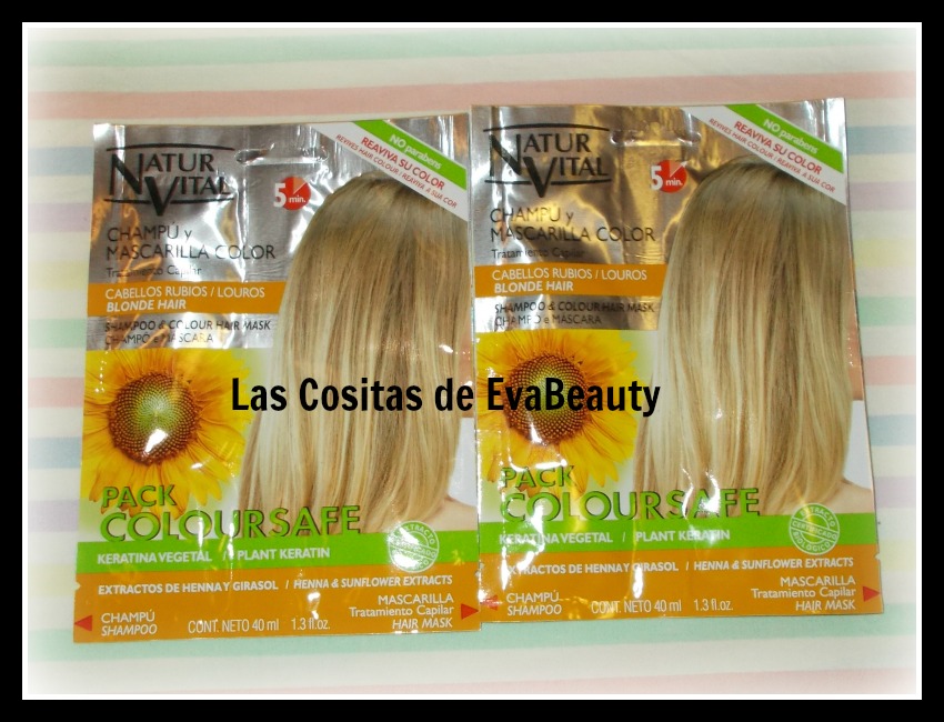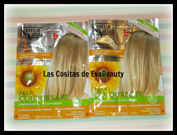 Me llamó mucho la atención estos sobres pack de champú y mascarilla capilar para cabellos rubios de la marca Natur Vital, y cogí dos sobres para probarlos.