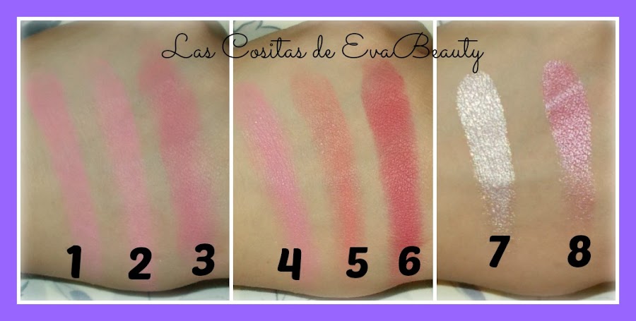 Iluminador 8: Tono rosado con toque plateado, la verdad es que como iluminador no lo veo, ya que queda muy pigmentado, lo veo más como para dar un toque de brillo al colorete, con cuidado.