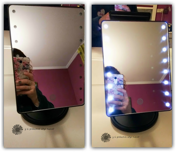 Tenía ganas de un espejo de este tipo con luces leds y me decidí por este. Lleva un cable USB para conectarlo a la red o se le pueden poner pilas, yo por el sitio donde lo he puesto le he dejado el cable pero según en qué zona lo pongamos puede venir bien el hecho de que funcione a pilas. He de decir que no tiene aumento pero igual le añado uno que tengo con ventosas y así me queda más completo. Cuesta 19,53€ es bastante grande y va muy bien, de momento las luces me funcionan todas perfectamente. Lo puedes encontrar aquí y encima algo más barato que antes.