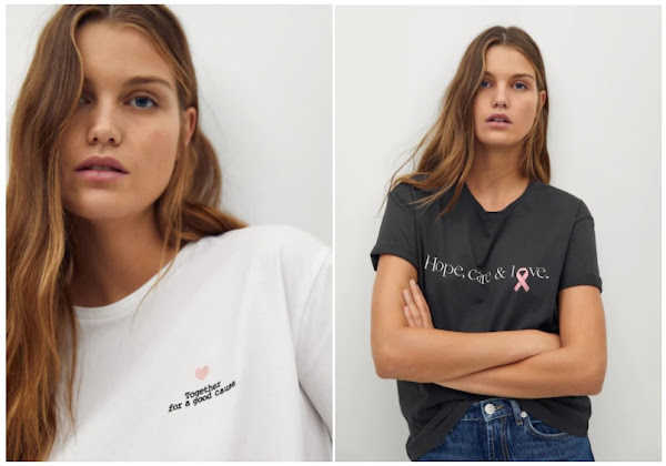 MangoColabora con la fundación Fero adquiriendo cualquiera de estos productos. Los beneficios de sus ventas irán destinados a la lucha contra el cáncer de mama. Camiseta (varios modelos): 15,99 € (100% algodón) y neceser: 7,99 € .
