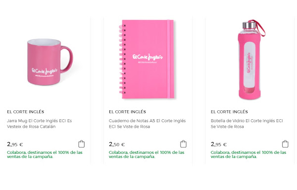 Siguiendo su fiel tradición de todos los años, en la cabecera de la web, puedes encontrar diversos productos solidarios haciendo clic en el lazo rosa: Compras Solidarias El Corte Inglés