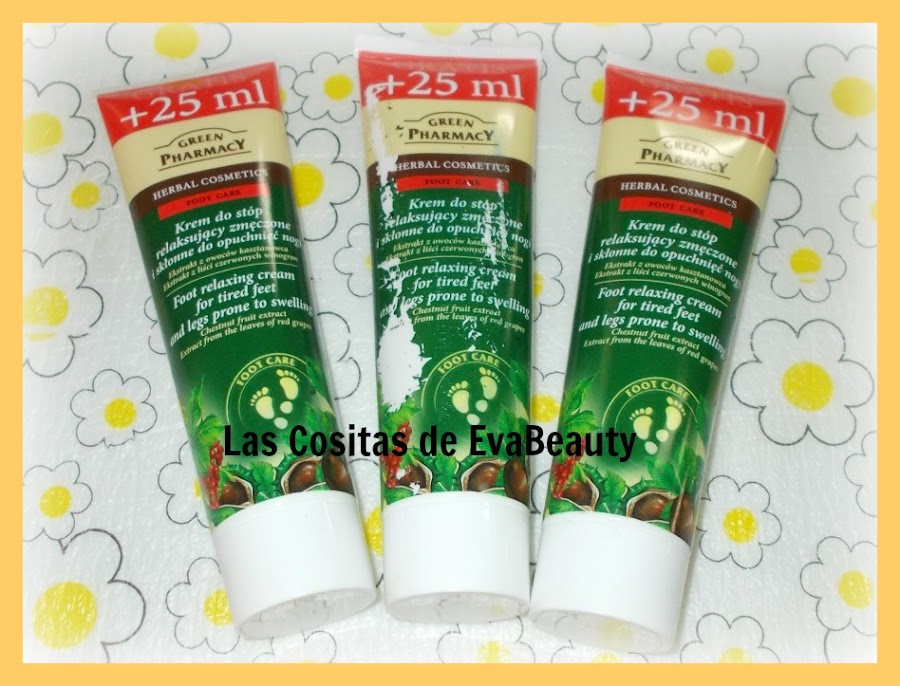 Y también cogí estas 3 cremas refrescantes para pies y piernas cansadas, de la marca Green Pharmacy. Tiene extracto de fruta de castaño de indias y uva roja.