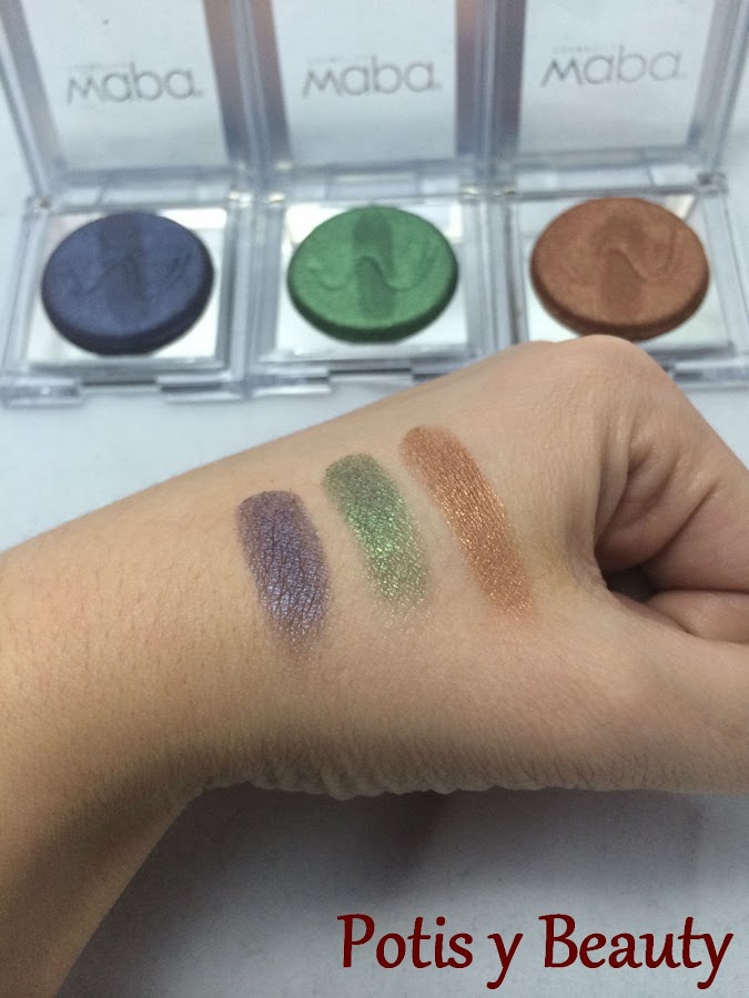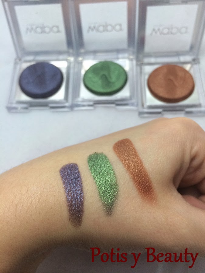 Me cogí las tres que mas suelo utilizar, azul número 014, verde número 013 y marrón número 009. Son sombras cocidas, se pueden usar en seco y en mojado, tipo metalizadas y son muy suaves a la hora de aplicarlas. Me gustan mucho y más en mojado. A continuación veréis la diferencia.