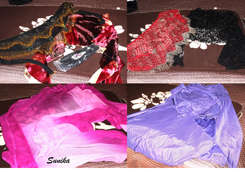 Finalmente la parte más importante de las compras que se centro en ropa para la danza del vientre. Aquí me tuve que contener porque sino me hubiera llevado la tienda entera, tenían cosas preciosas. Finalmente que quedé con dos faldas para ensayo, una en tonos rojos y otra en encaje negro. Luego me hice con un cinturón negro con detalles dorados y un pañuelo rojo con los detalles en plata. También me llevé además un velo en tonos rosas y unas zapatillas de danza. Todo esto además del objetivo principal de ir a la tienda que era comprar un traje completo de baile en un color morado claro brillante para nuestra próxima actuación.