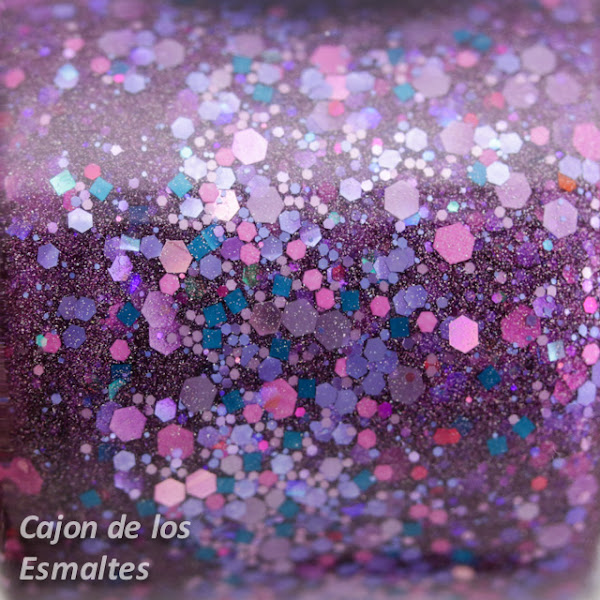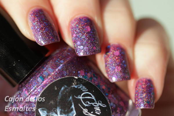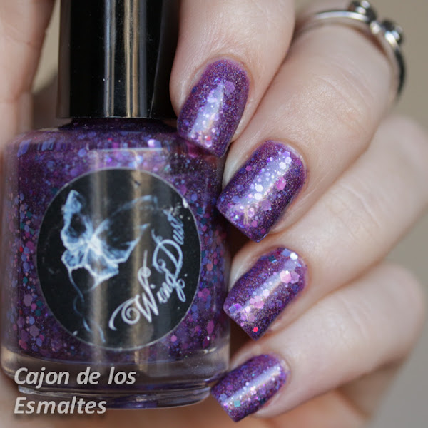 No tenía en mi radar a Wing Dust, mi primer cruce fue el propio post de Maru donde lo había mostrado pero había olvidado los detalles así que fui gratamente sorprendida por el esmalte. Porque como si no alcanzara con la belleza de un jelly sandwich violeta con glitter rosa, turquesa, rojo y plateado que cubre 100% con dos capas la gente de Wing Dust se las ingenió para ponerle también holografía. La primera vez que lo vi al sol casi me desmayo, y creo que es el único esmalte holográfico que he probado que no me decido si me gusta más a la sombra o al sol.