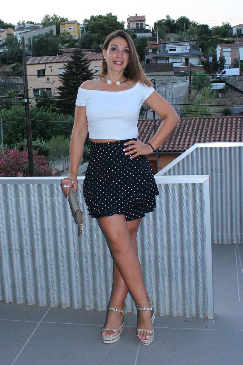 Así es como escogí el look de hoy, corriendo y a toda prisa, una falda y una camiseta, perfecto para una noche de verano. Me decanté por una de volantes con lunares (como no, my obsession this summer!!!), conjuntada con una camiseta crop top con los hombros al aire. Hasta aquí la ropa elegida, pero aunque no tengamos prisa y montemos un look sencillo, siempre tenemos que jugar con los complementos para sofisticarlo un poco y adecuarlo a dónde vayamos. En mi caso era una cena informal, con lo que opté por por cuñas en color dorado, collar de perlas y bolso a tono con los complementos, y este es el resultado, que para no tener demasiado tiempo, no está mal