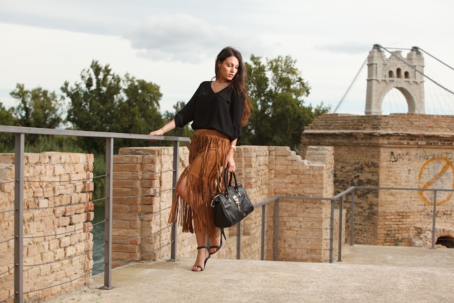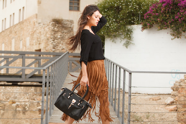 Si hay algo que no puede faltar esta temporada en tu armario es alguna pieza de antelina con flecos ya sea en negro, camel, taupe, mostaza o burdeos! En el look de hoy os presento mi nueva falda de flecos en color camel y tejido de antelina! Sencillamente me encanta! Aunque con blanco también queda ideal esta ocasión aposté por combinarla en negro. ¿Qué os parece?¡Espero que os guste el outfit!