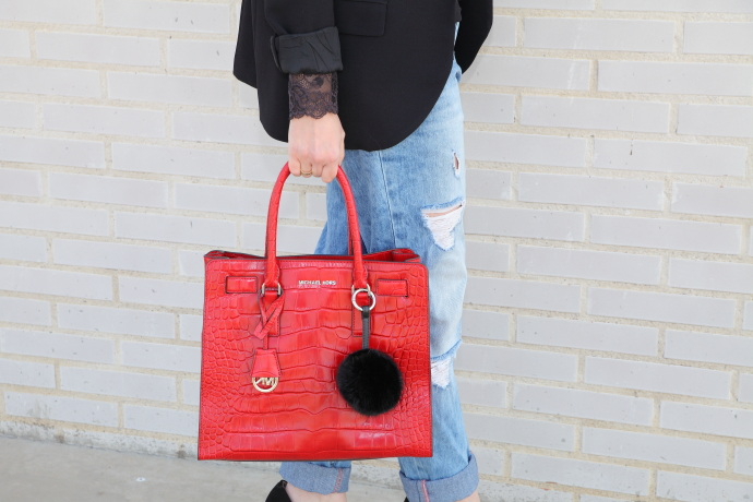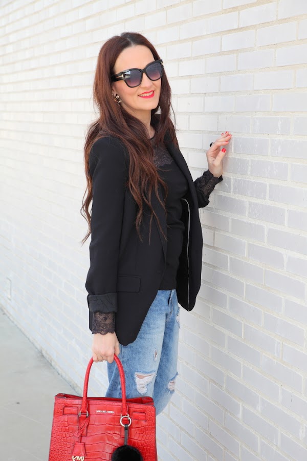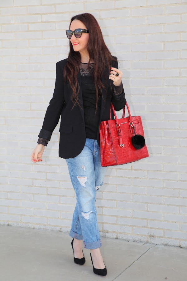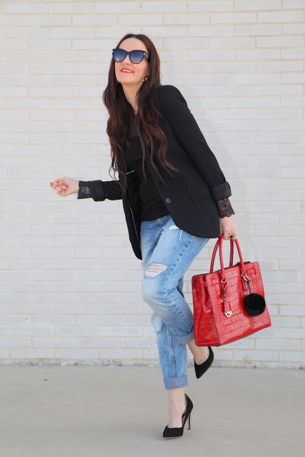 La semana pasada ya os hablé de lo contenta que estaba con mis nuevas extensiones de clip para el cabello de Irresistible Me. Muchas fuisteis las que me comentasteis que os apetecía ver como me quedaban, así que hoy os he traído mi primer look con ellas. Como están hechas con cabello real y son exactamente de mi color de pelo como veis quedan muy naturales. Además, ese día opté por llevar las puntas onduladas consiguiendo un efecto melenaza que me chifla. Para el estilismo me decanté por un estilismo más sobrio con blazer negra, camiseta lencera, que tiene unos puños realmente preciosos y jeans boyfriend. El toque chic lo di con mi bolso rojo favorito y mis nuevos pendientes de flores, atrevidos pero a mi me tienen loquita de lo bonitos que son.