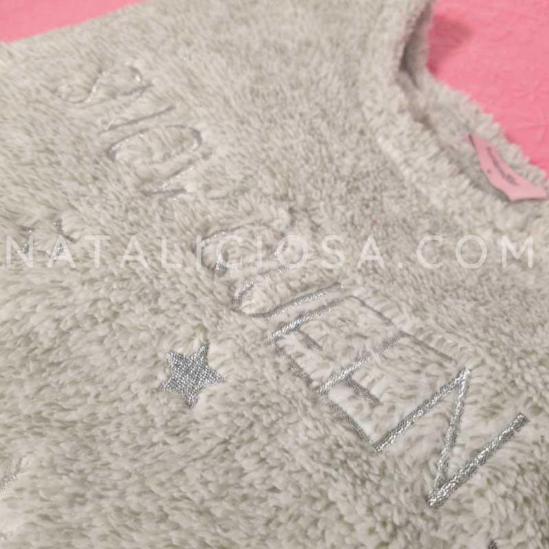 El tejido es 100% poliéster, muy pero que muy calentito al tacto. En realidad es ideal para abrazar un chocolate caliente en el sofá, aunque ya veis que a mí me toca darle un uso un poco menos glamuroso (mi moño se queda conmigo por más tiempo, está claro).