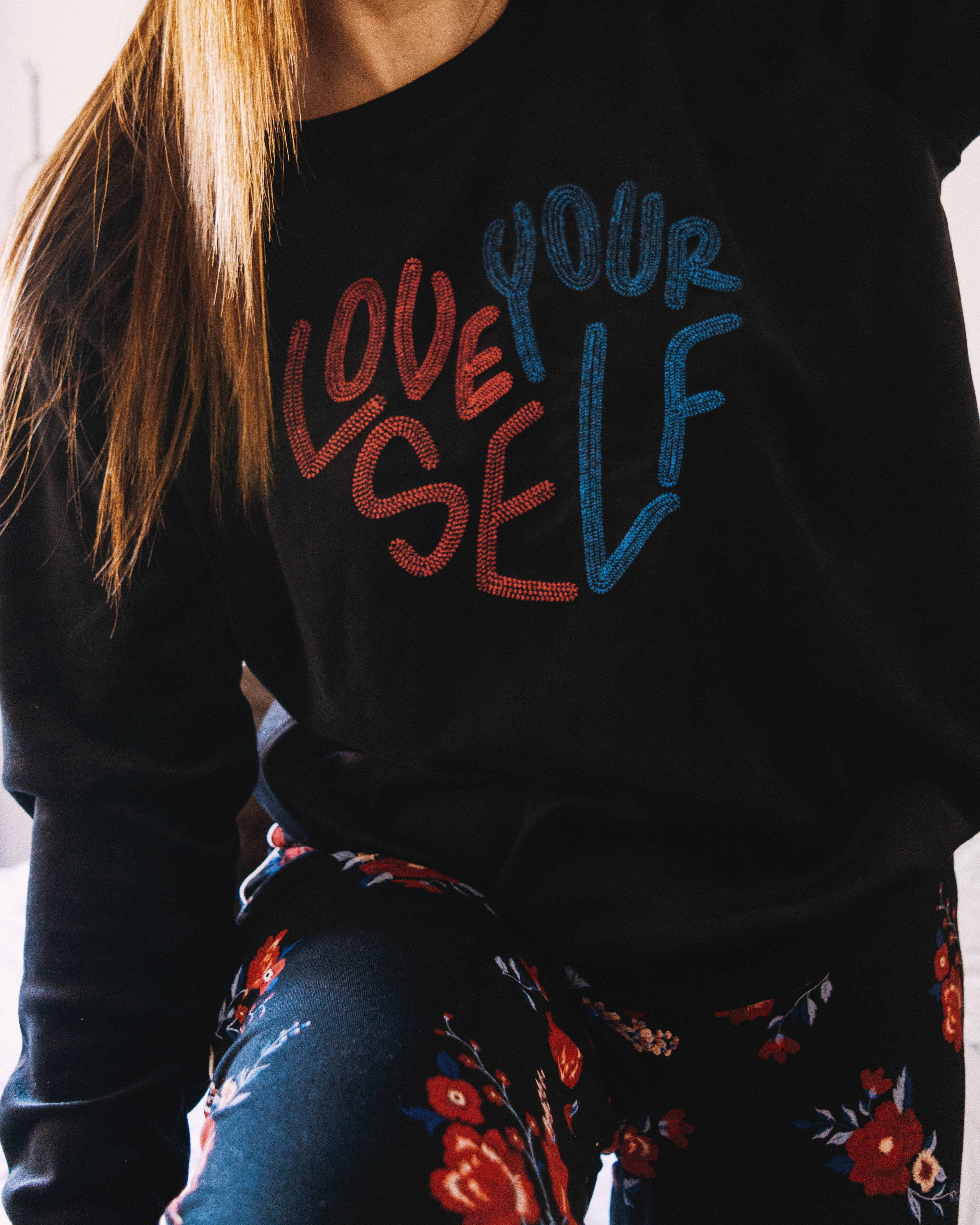 Hoy os enseño uno de mis nuevos favoritos, realmente cómodo y súper estiloso, parece un chándal. Este en concreto son dos piezas individuales que he combinado entre sí. Un pantalón fluido con puño inferior, con fondo oscuro y flores rojas que combino con una sudadera de terciopelo del mismo color con el texto en rojo y azul como el pantalón. ¿Qué os parece?