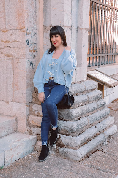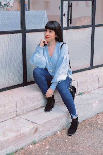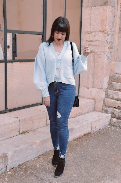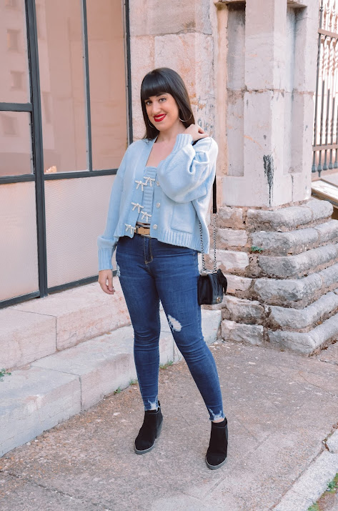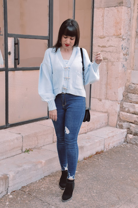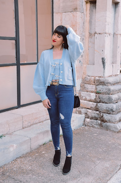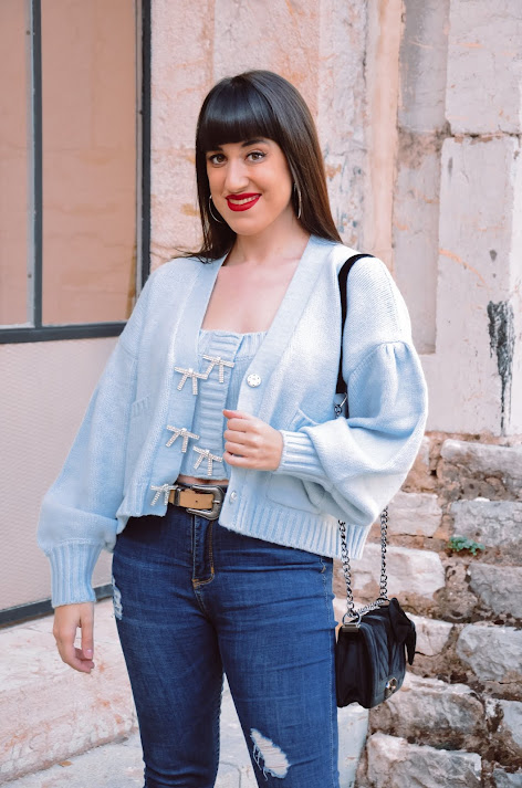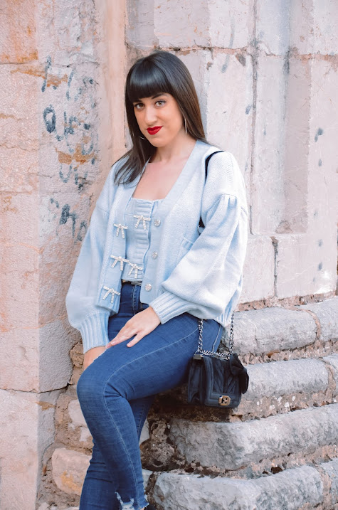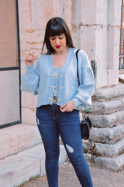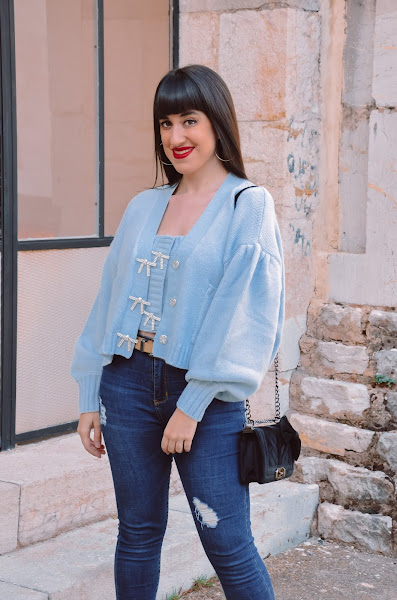 Estaba deseando enseñaros este look porque estoy literalmente enamorada de este precioso conjunto de cárdigan y top con botones de lazos con brillantes de Shein.