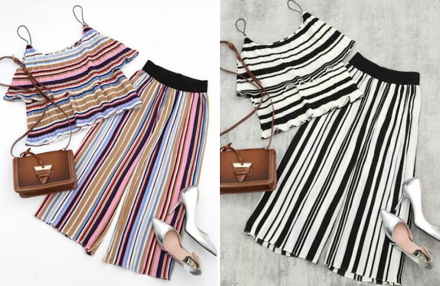 Mis favoritos son estos dos, con pantalón crop y top de tirantes y volante, con multirayas de color, que me lo imagino perfecto para un día de trabajo los días calurosos.