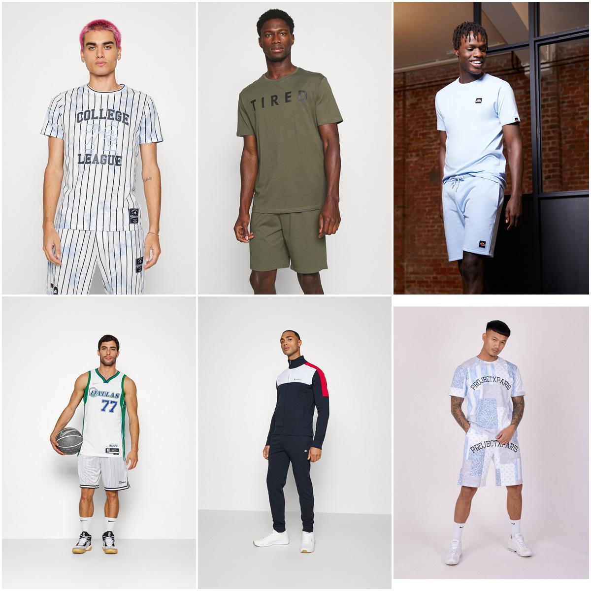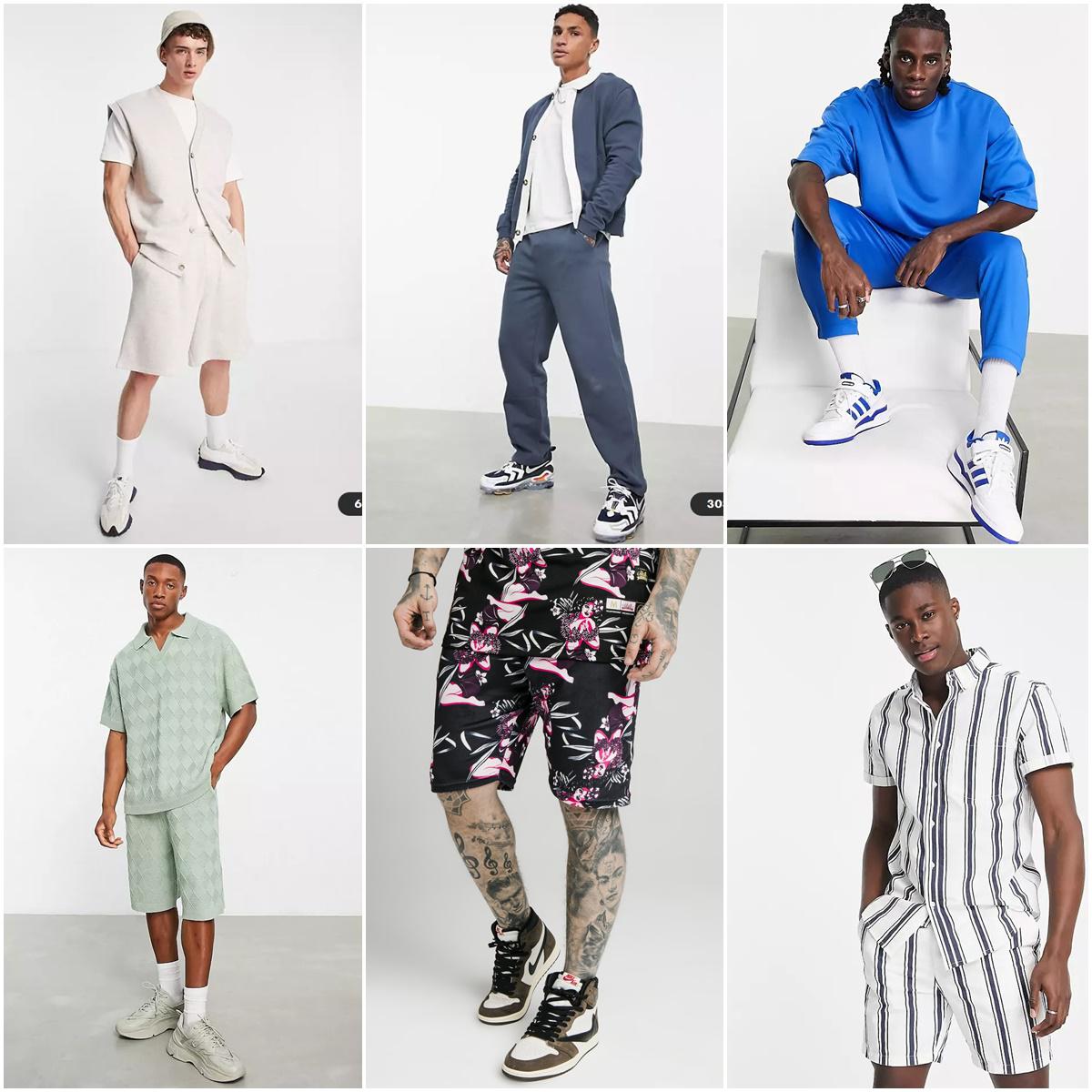Los conjuntos para hombre pueden llevar cualquier combinación: camiseta y pantalones de chándal, sudadera con capucha y pantalones cortos, cárdigan y pantalones de chándal, chaqueta y pantalones, etc., siempre que combinen entre sí. Los conjuntos pueden ser elegantes, casuales, deportivos, relajados, escandalosos o cualquier cosa intermedia.