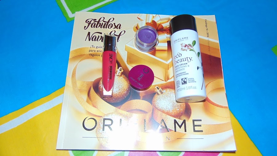 En mi paquetito venía un catálogo navideño el que tocaba este mes de Oriflame, la crema facial protección intensiva y antioxidante de Ecobeauty, gel de labios lip sensation vinyl the one tono 32445 sunset burst, sombra de ojos en crema colour impact the one tono 32795 purple wow y muestras.