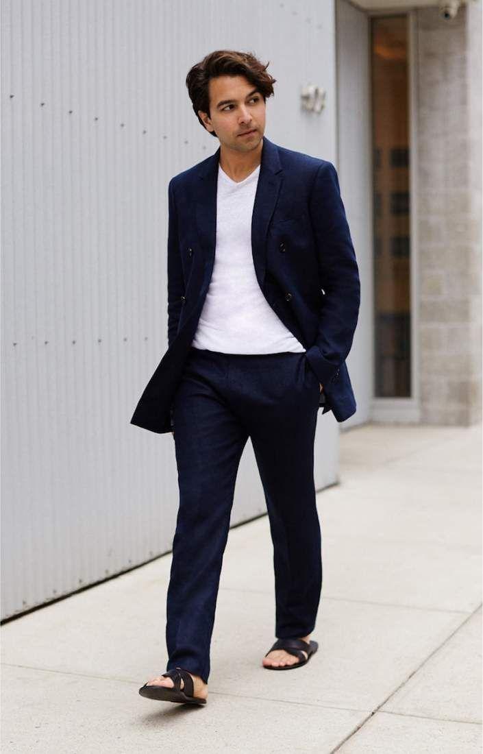 Por supuesto, no puedes usar un traje de 3 piezas con sandalias ya que son calzado informal. Si quieres optar por unas sandalias y un traje, busca uno que esté un poco relajado.