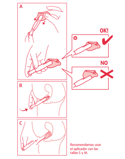 No uso el aplicador porque para mí es un coñazo (palabra intencionada, el contexto lo merece), pero si alguna lo prefiere simplemente hay que pellizcar con el aplicador la copa en el lateral donde se acumulan las dobleces, para evitar que al introducirla se abra antes de tiempo.