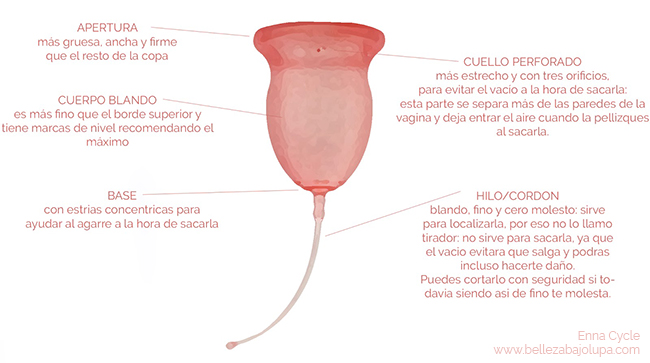 La copa de Enna tiene un estrechamiento justo antes de abertura, que es más gruesa y por tanto más firme agarrándose a las paredes de la vagina. Esta zona de estrechamiento tiene además unos orificios para ayudar a quitarla sin sufrir daños por el efecto vacío. Aunque hace el vacío perfectamente a la hora de ponértela y saber que está segura. No te asustes: gracias a la tensión superificial a la hora de sacártela por los orificios no caerá sangre a pesar de que la ladees un poco.