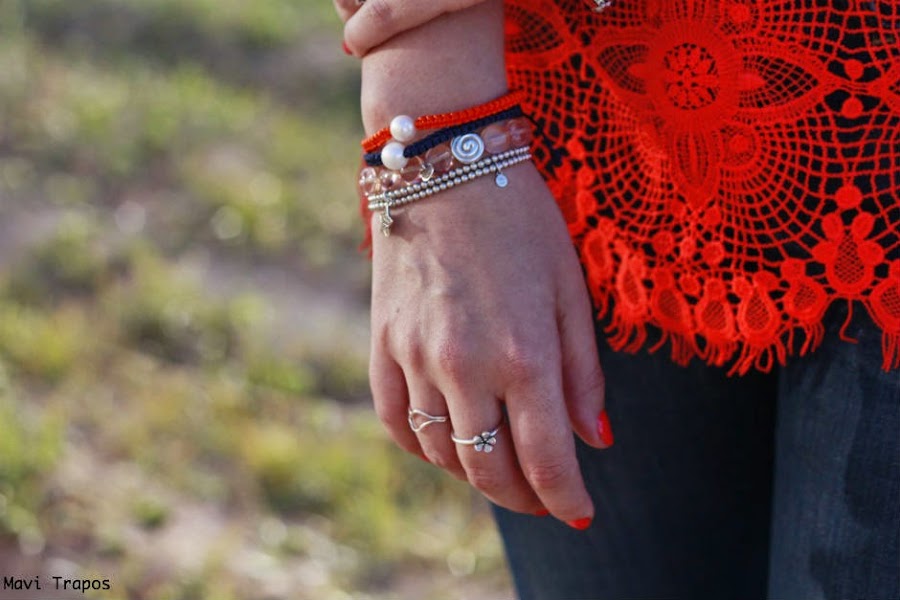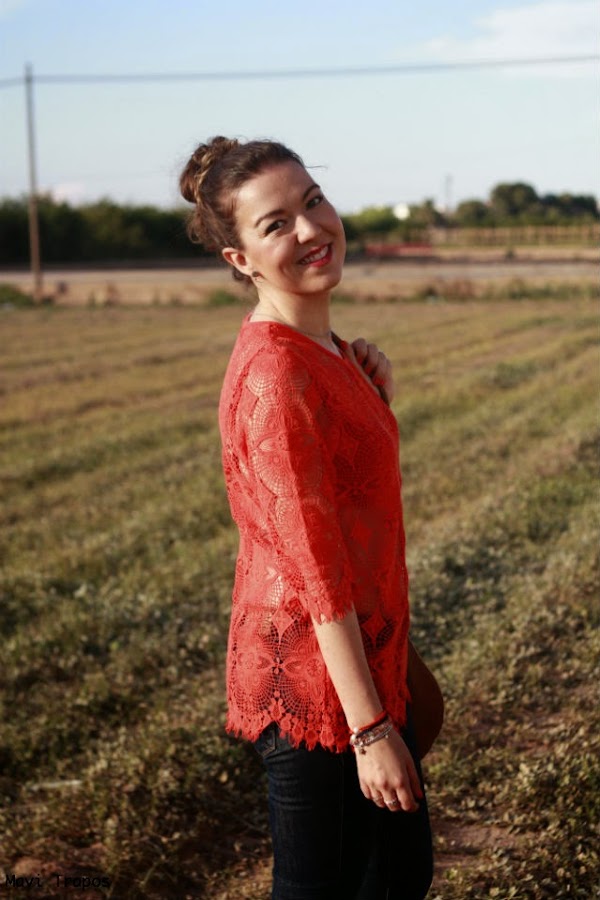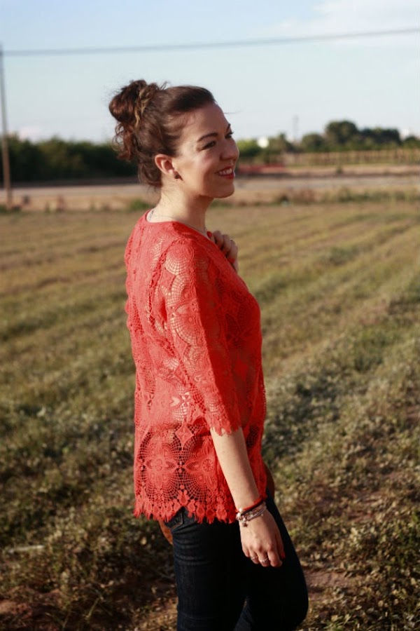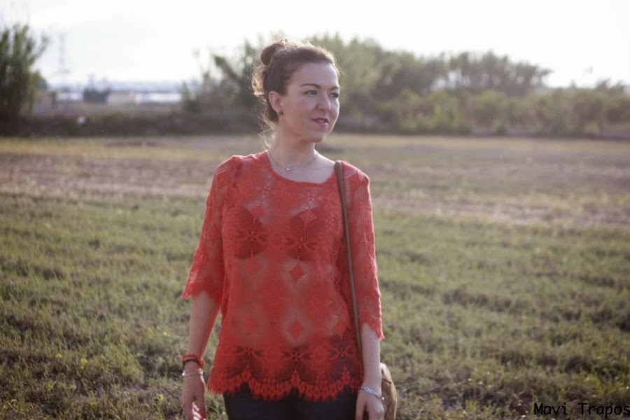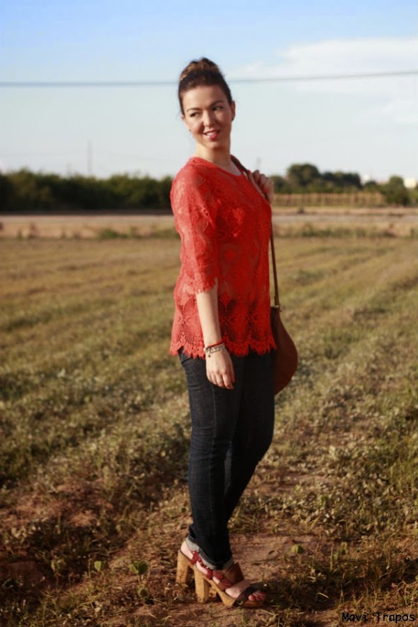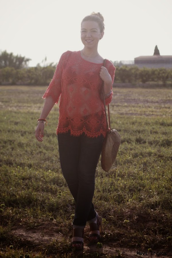 El top me tiene más que enamorada: las transparencias me encantan y el color coral tan vivo que tiene es uno de mis favoritos, además para verano es muy favorecedor. El resto del look, sencillito, vaqueros, sandalias con la suela de corcho y el bolso redondo (van tres) comodidad ante todo.