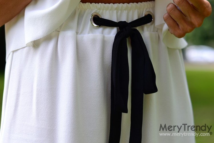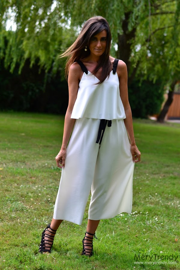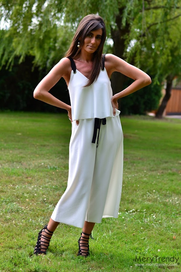 Hasta aquí, nada nuevo bajo el mar, pero, si os fijáis bien, tiene la particularidad de que, tanto los tirantes del top como el cordón que trae para ajustar el palazzo a la cintura son de color negro. De ahí que me haya fijado en este conjunto, pues me parece que ofrece un contraste muy apetecible a la vista y, ni qué decir tiene lo cómodo que resulta gracias a la holgura de la parte de arriba y a la goma elástica de la cinturilla de la parte de abajo.