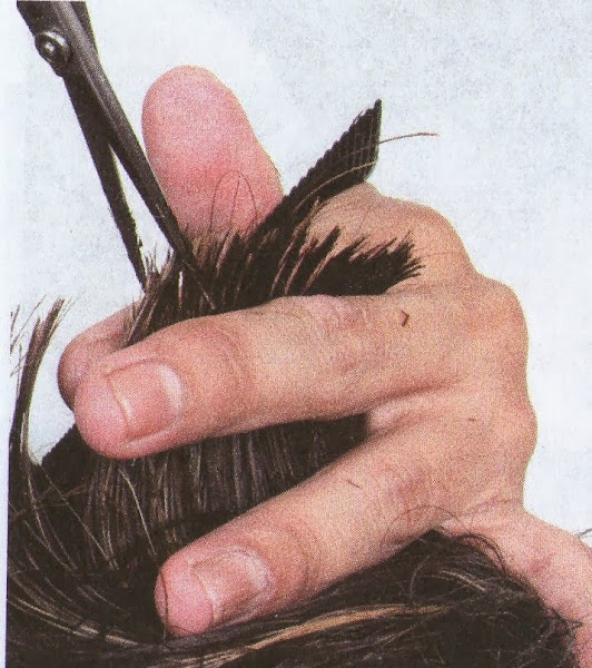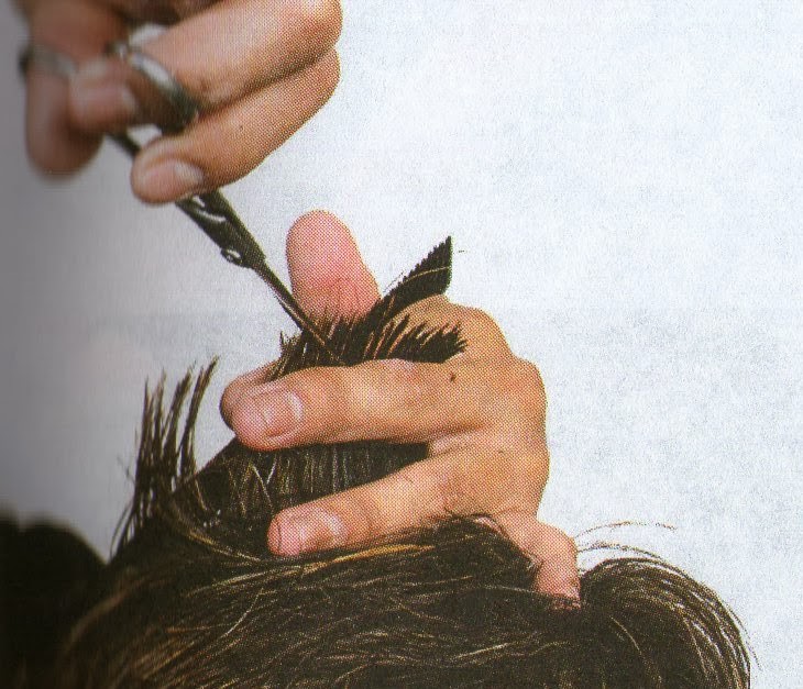 6-Sacar 4 mechones de la parte frontal, elevar cada uno a 90º y hacer piquetes en forma de zigzag en las puntas, la altura del cabello en esta zona debe quedar de dos a tres centímetros, partiendo del cuero cabelludo.