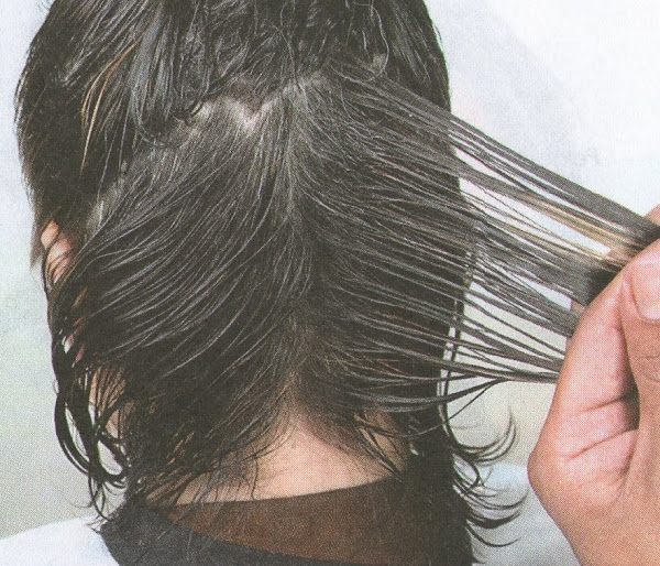 PROCEDIMIENTO:1-Dividir para sacar una primera capa de cabello en forma de zigzag en la parte de la nuca baja y a la altura de la mitad de la oreja.