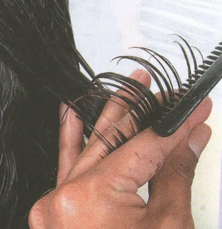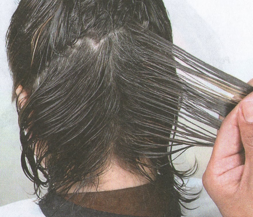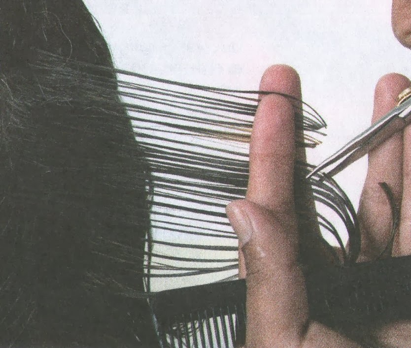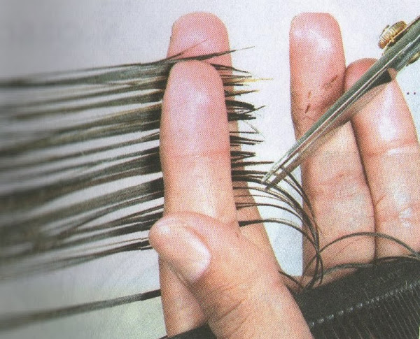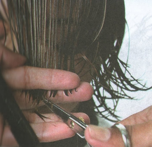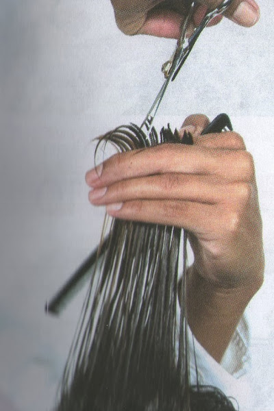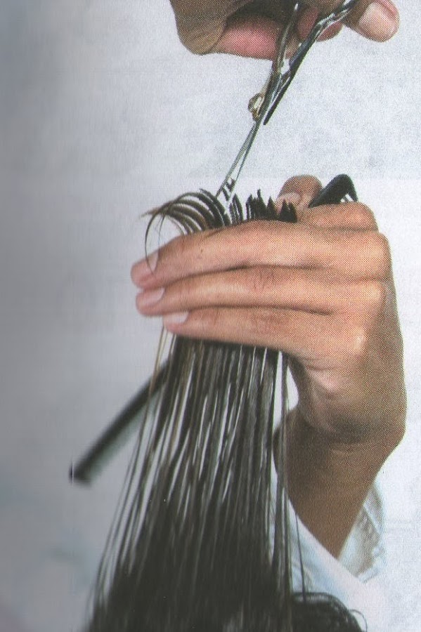 13-Despuntar los largos desde la nuca baja hacia la parte lateral frontal, en forma de piquetes, para obtener un ligero desflecado.
