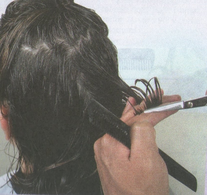 3-Recortar las puntas de los mechones en zigzag para así lograr una caída pespuntada, seguir cortando las puntas de los mechones en piquetes hasta llegar al lateral derecho de la nuca baja, hacer igual en el lado izquierdo.