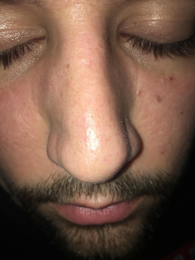 En estas fotos podéis ver que en la primera mi novio tenía bastantes puntos negros en la nariz, y en la segunda no tenía a penas, el tiene una piel sensible pero grasa por eso en su piel era algo más reactivo el producto haciendo que se pusiese rojita.