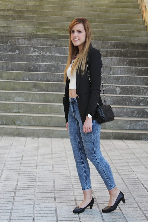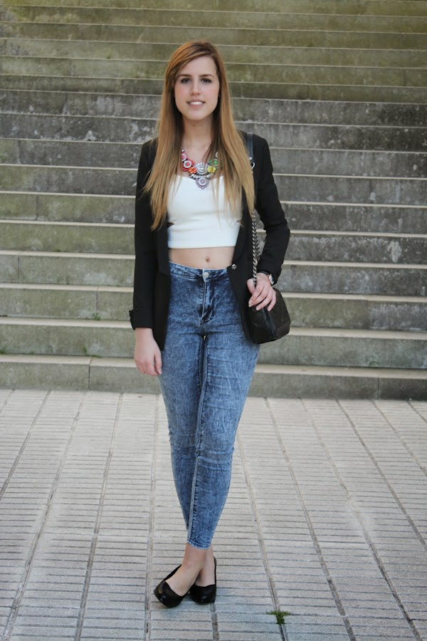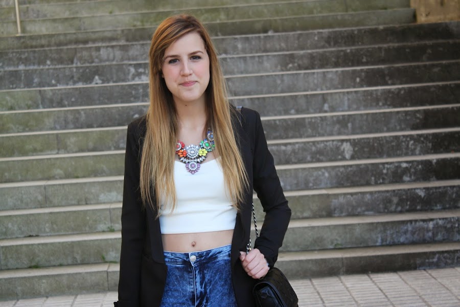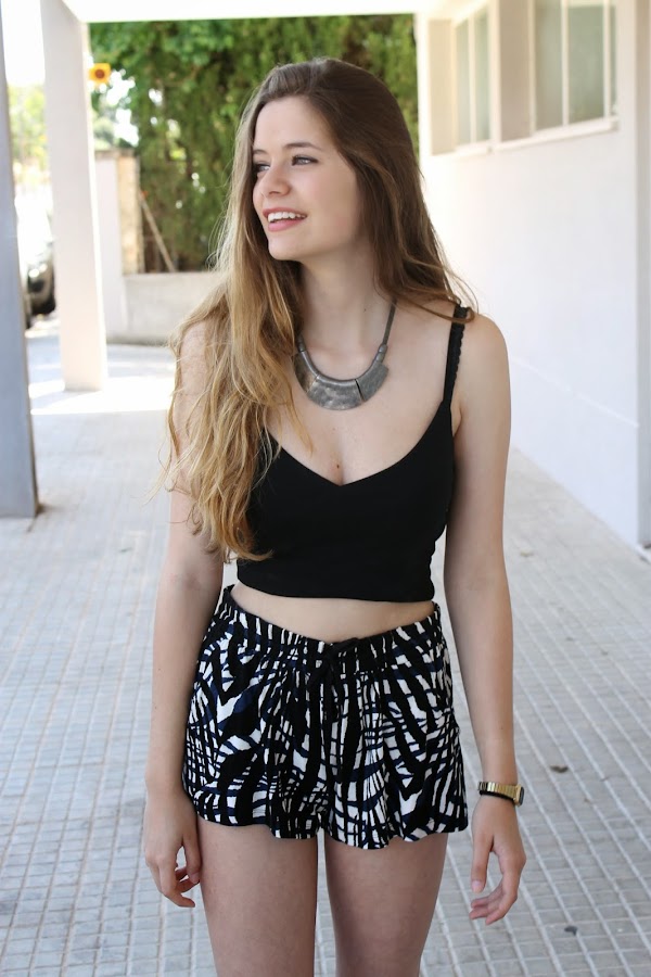 En el post de hoy podréis ver dos formas de combinar un crop top, entre ellas son muy diferentes. Andy lleva un croptop blanco con jeans y blazer junto a un collar precioso. Y yo llevo el crop top negro con unos shorts con estampado y un collar neutro.