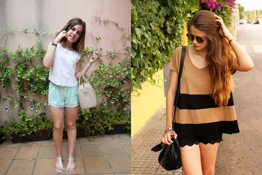 En el post de hoy os enseñamos dos look diferentes pero iguales. Las dos utilizamos pantalones lenceros, bolsos grandes y sandalias del mismo tipo. Los looks no se parecen para nada pero como podéis observar los elementos sí.