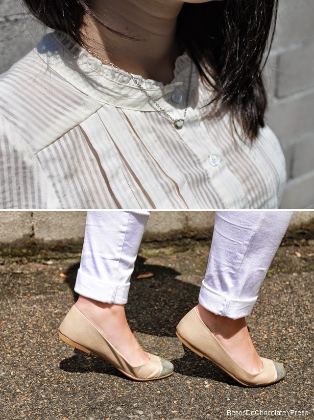 La combiné con pantalones blancos, un básico imprescindible del verano y complementos en nude como el clutch en distintas tonalidades de marrón, bailarinas archi-conocidas XD y collar de corazón en blanco de Mucurundu.