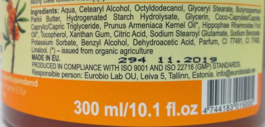 Su aroma es ¡una auténtica delicia!, ya que, se aprecia, perfectamente, un toque dulzón, aunque bastante suave y sutil. Ésto es debido a que está enriquecida, principalmente, de extracto de espino amarillo y albaricoques, los cuales, tienen acción calmante y regeneradora, por su altos contenidos en vitaminas E. Por ello, me parece que es perfecta para las pieles sensibles y que se suelan irritar con facilidad, por ciertos motivos y/o circunstancias.