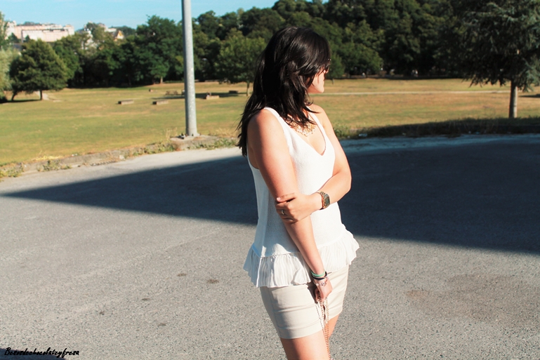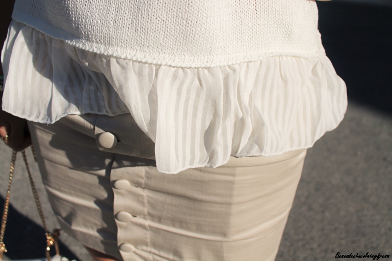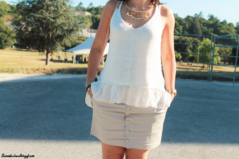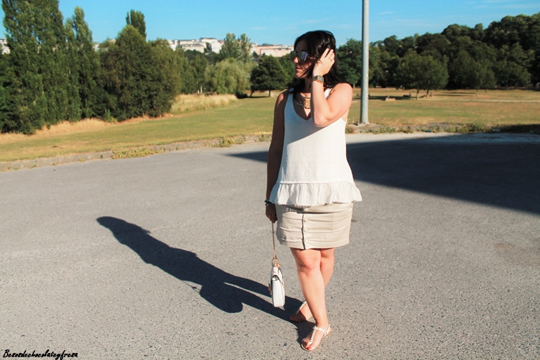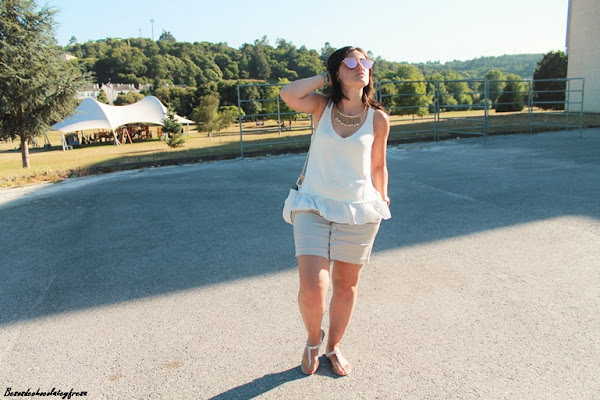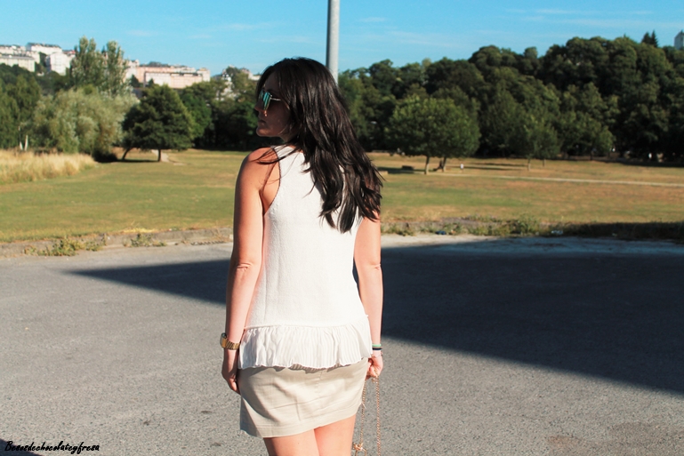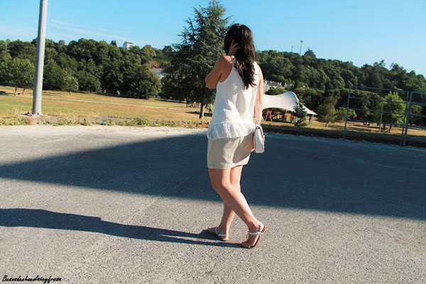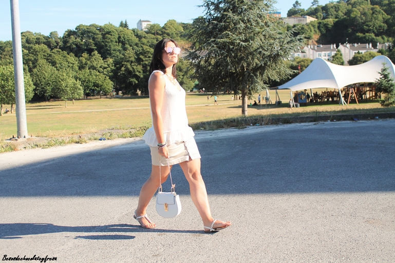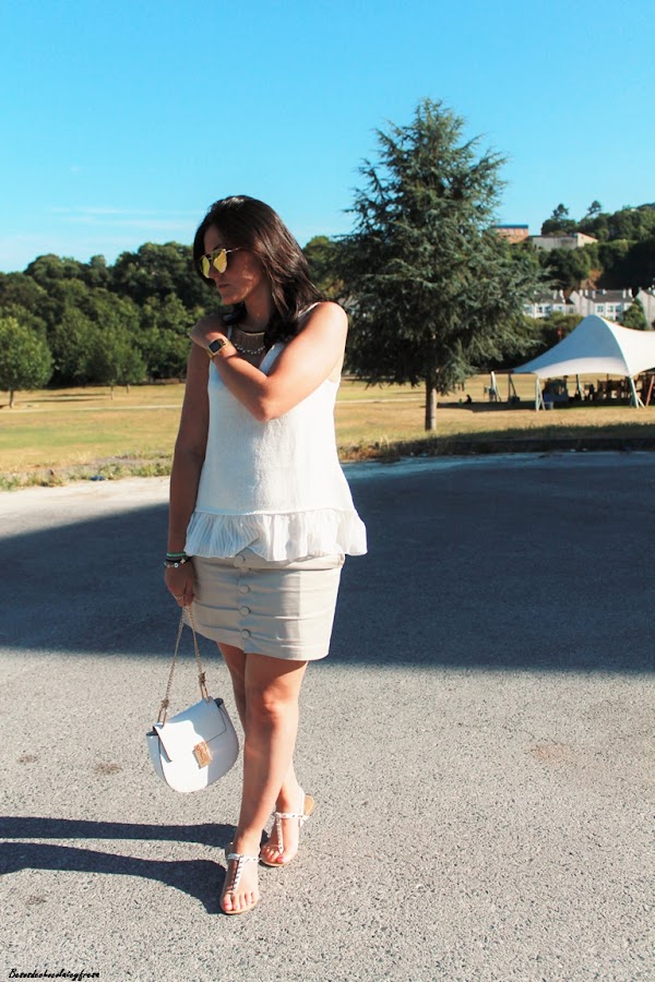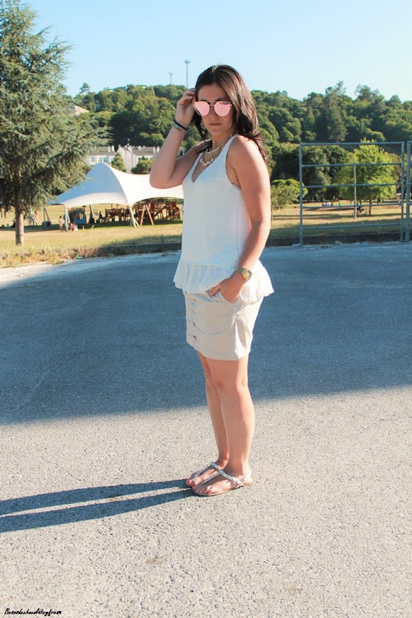 Hoy os traigo un nuevo look, esta vez en tonos crema con dos de mis nuevas adquisiciones, por una parte camiseta de punto con volantes de tela en la parte inferior, súper bonita y versátil y mis nuevas gafas de Rosegal efecto espejo en rosa (enamorada no es la la palabra jeje). Completan el look una falda con botones delanteros en nude, sandalias de pinchos y bolso blanco tipo Celine.