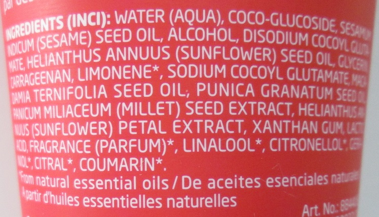 Tiene un aroma cítrico-afrutado ¡fabuloso!, aunque no sabría si deciros si me gusta más ésta que la otra que probé..., pero si que el producto en sí, ¡os encantará!, jejeje. Gracias a los aceites esenciales de naranja, davana, macadamia y vainilla, además, de aceites de semilla de granada, neroli, sándalo y sésamo, no sólo limpia suavemente, mientras estimula los sentidos con su aroma exótico y cítrico, sino que, mantiene la piel hidratada, protegiéndola, así, de la sequedad. Y, también, ayuda a calmar, suavizar, estimular y revitalizar, nuestro cuerpo.