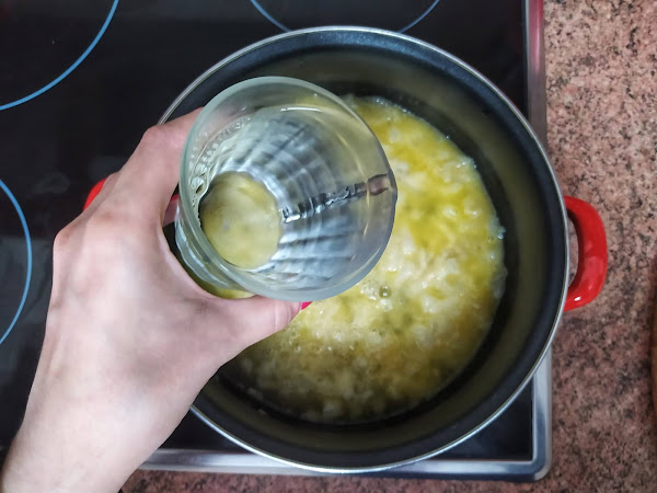 Añadimos el líquido de la lata de espárragos, un vaso de agua y la pastilla de caldo de verduras.