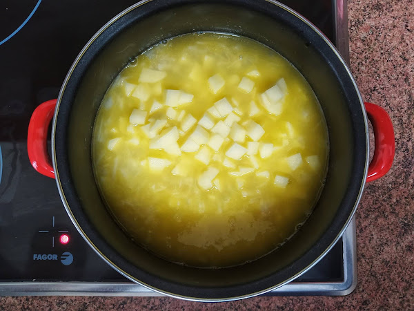Añadimos las patatas cortadas previamente en cuadraditos muy pequeños. También sal pimentamos al gusto. Dejamos que cueza todo bien a fuego medio. Cuando pinchéis la patata con un tenedor y esté blandita, ya esta lista. Retiramos del fuego.