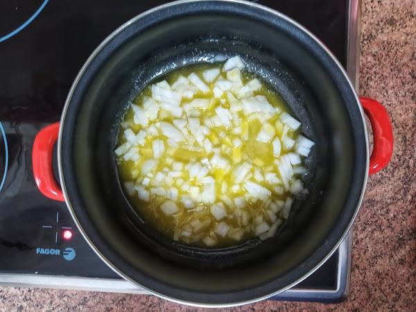 Pelamos y cortamos la cebolla. En una cazuela añadimos la mantequilla y cuando este derretida, añadimos la cebolla y los tallos. Doramos todo bien.