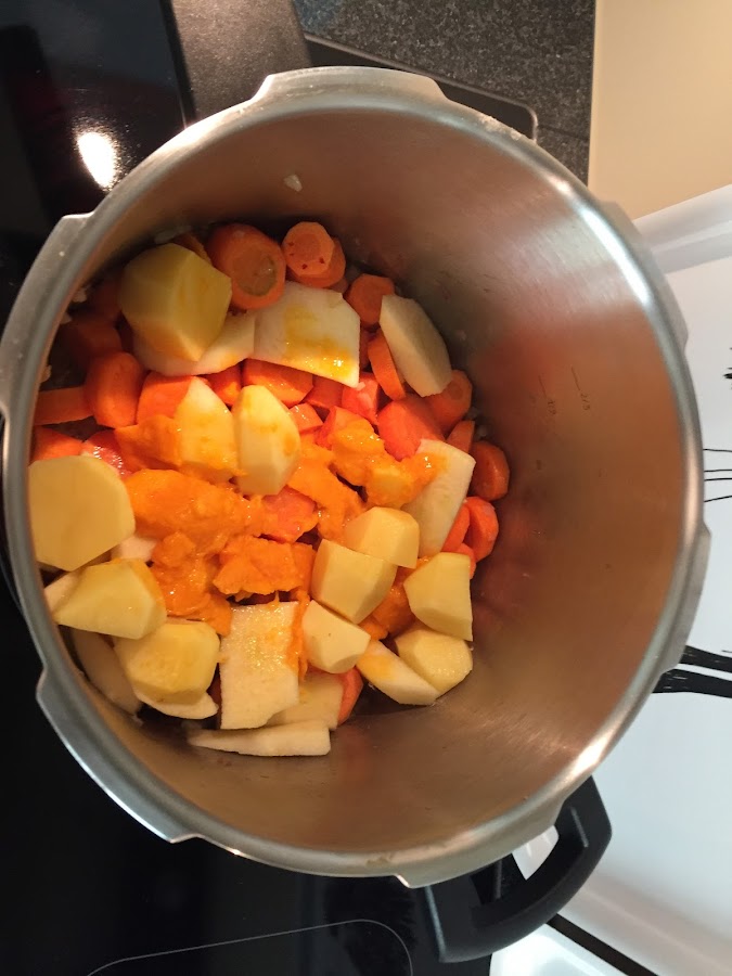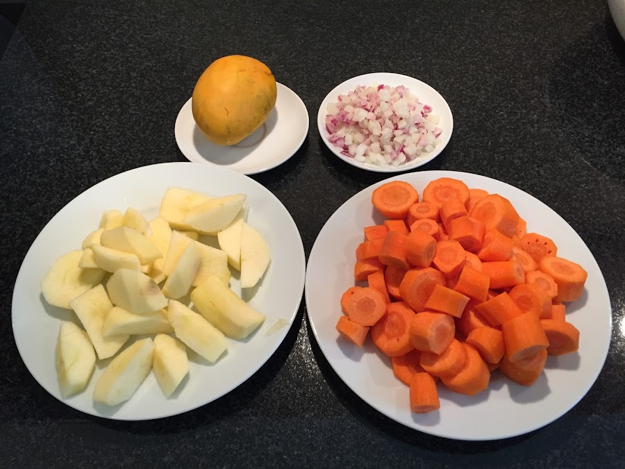 Picamos todas las verduras, y pochamos la cebolla y el ajo con una cucharada de aceite. Después echamos las zanahorias, las manzanas y el mango y salteamos durante unos minutos agregando un pellizco de sal.
