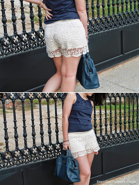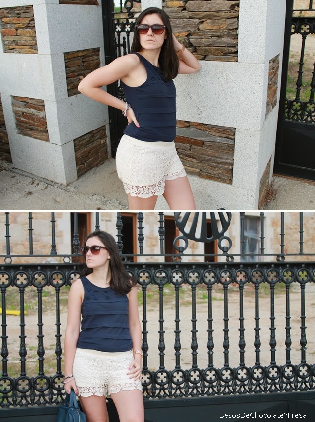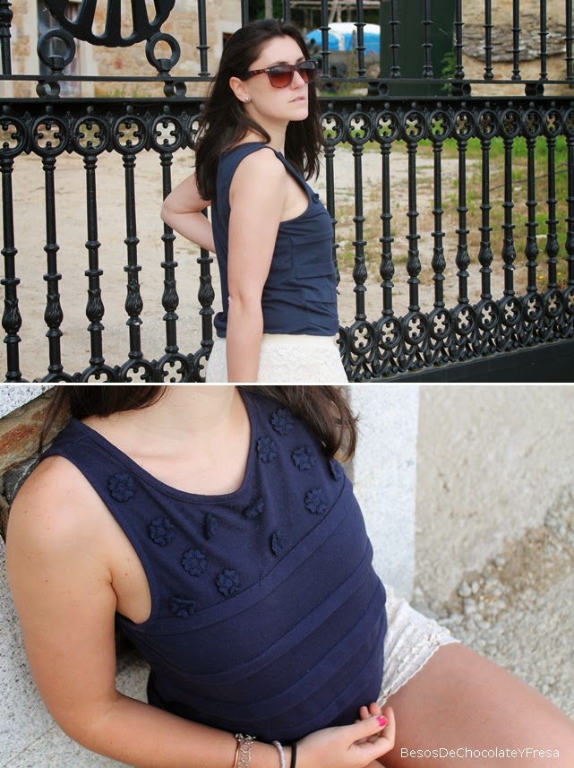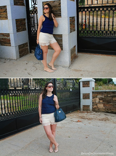 Para esta ocasión para luego ir a tomar unas cañas con unos amigos, me puse los shorts de crochet en nude con camiseta en azul marino y flores cosidas en la parte superior, como complementos sandalias de brillos nude y bolso azul.